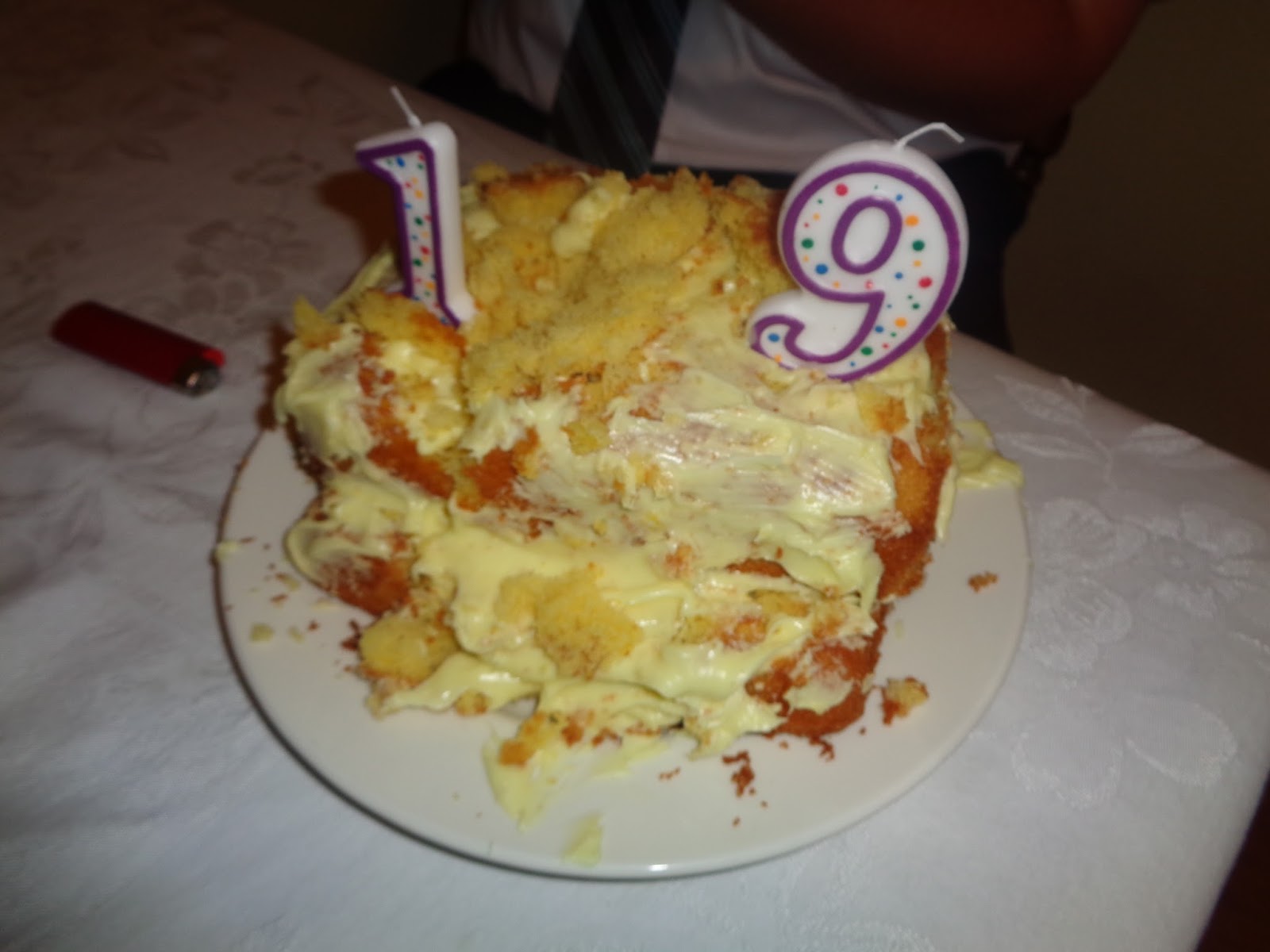 | When 19 year old boys make their own birthday cake... We sent him the cake mix, frosting and candles. |